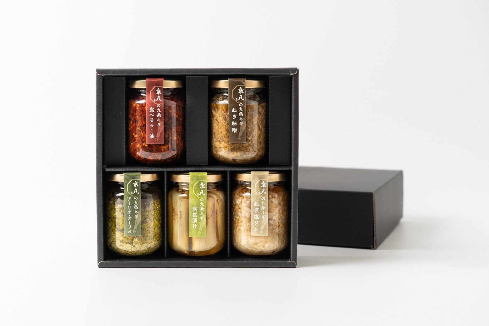九条ネギをたっぷり使用した、無添加のビンシリーズ5種ギフトセット。(丸瓶タイプ・1個あたり100g)